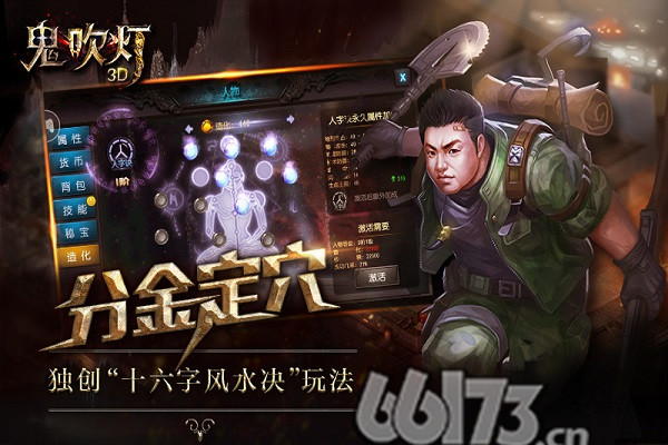《鬼吹灯3D》手游在玩法上突破创新,给玩家高自由度的战斗体验,游戏100%重现原著小说剧情,再现鬼吹灯小说倒斗元素,更有《十六字阴阳风水秘术》造化系统,助你寻龙探墓摸金倒斗。重现鬼魅经典,利用3D技术在手机端展现电影级游戏画面,带来强烈的视觉冲击,爆棚的代入感。