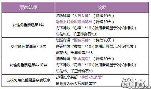 女神大赛奖励丰厚,每个服务器票数排名前十的参赛女神以及女神最给力的支持者都会获得奖励。前十名的女神不仅会获得绝版称谓,还会有全服光环特效“蝶恋”、“初雪”、“烟花”等,此外,第一名的魅力女神还将获得上线全服通告的特权,女神驾到,还不来迎接!