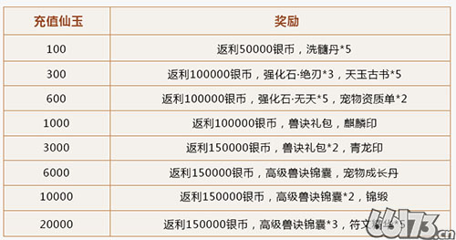 首充奖励:变异宝宝转运锦鲤(超值群法宝宝)、50000银币、洗髓丹*5、天玉古书*10、宝石*2、活血灵药、千年人参酒