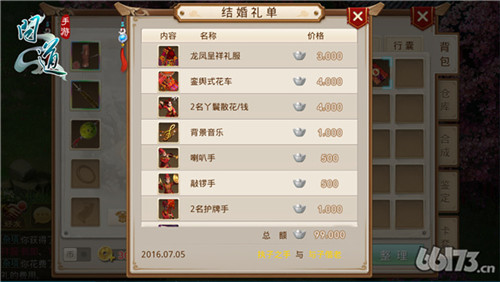 双方友好度达到5000后,道友就可以去向心仪的她提亲啦!男方带队去天墉城找NPC“红娘”,由红娘出面向双方师尊说媒。男方需依据聘礼清单略备薄礼,方能娶得美娇娘。一坛10斤的上等女儿红、十匹色彩不同的丝绸和一面鉴心镜,想必都是难不倒各位道友的。然后就等道友们选个良辰吉日去找月老帮你们主持结婚典礼吧!