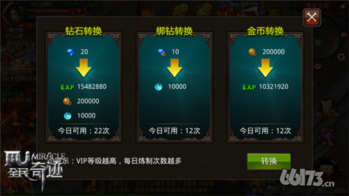 除了每日必做、竞技场福利之外,《全民奇迹MU》中的转换系统也可以使玩家获得大量游戏资源。奇迹玩家可以根据自己的实际情况进行金币转换、绑钻转换或者钻石转换,每一种转换都会有大量的资源奖励。
