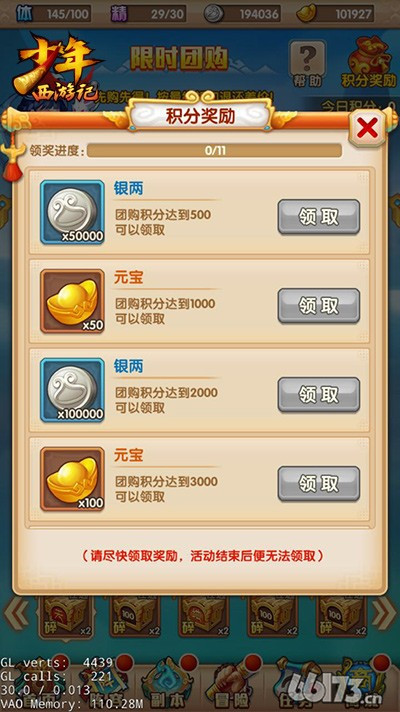 在【限时团购】进行购买后,少年们可获得对应团购积分,1元宝=1积分。当团购积分达到指定的数字时,可兑换相应的银两和元宝。要注意的是【限时团购】中的物品和积分会在每天0点重置,少年们要尽快领取奖励哦!