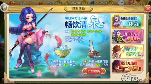 大家最常见的,就是体力的自然增长。其次,体力还可以通过精彩活动中免费领取。每天可以领取三次,共计180体力。另外每天也可以花1块钱购买120体力。价格非常实惠,建议购买。