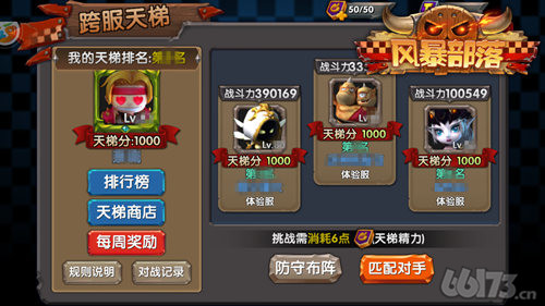 玩家达到一定等级之后自动开启跨服天梯功能,只要玩家参加过单服竞技场战斗即可以进行跨服战。65游戏《风暴部落》跨服天梯匹配不受时间限制,玩家可以在任意时间点随时进行匹配,可以匹配到不同服务器的玩家作为对手。系统将自动为您寻找和您实力最相近的玩家作为您的对手。