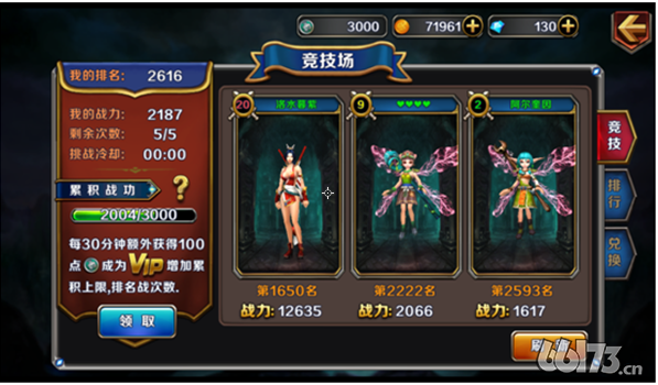 玩家每天可挑战五次竞技场,从三位系统匹配的对手中选择一位进入竞技场PVP模式。查看对手和自己的当前排名以及战斗力信息。需要冲刺排名,可以选择排名跨度较大的对手;稳扎稳打型的也可选择与自己实力相当的对手进行战斗。每30分钟玩家可获得竞技场点数,排名越高点数越多,点数可以在竞技场的商城兑换极品装备碎片。
