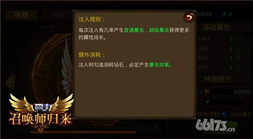 值得一提的是,新资源“神力精华”的获取并不容易,每周的获取更是有着较为苛刻的上限。想要快速获激活神器,拥有神力加身的勇士们,不妨在为神器们注入神力精华时勾选消耗钻石,随之而来的必定普通暴击和超级暴击几率的提高,让咱们能够更快的拥有众神之力!