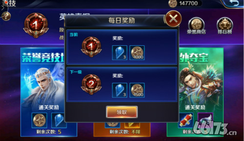 每日奖励包括了宝石和荣誉积分,对应玩家的段位发放。段位越高的玩家,获取的奖励也会越丰厚。