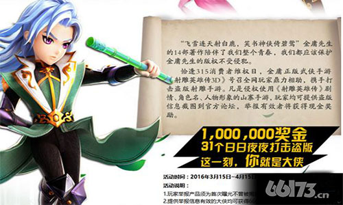 有鉴于此,为维护《射雕英雄传3D》手游的正版权益,完美世界于今年315斥资百万开展“射雕英雄”维权活动。目前,已有数十款 “蹭射雕IP”的手游被网友举报,完美世界也将在活动结束后,统一向核实为侵权射雕手游的举报玩家发放666元现金奖励。