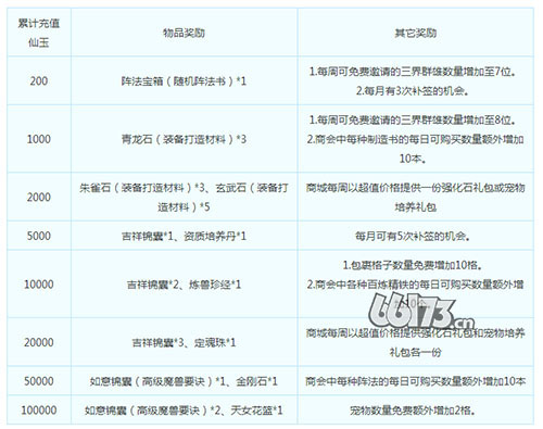 真情回馈玩家,玩家角色累计充值一定数量的仙玉,即可获得额外物品或福利赠送。